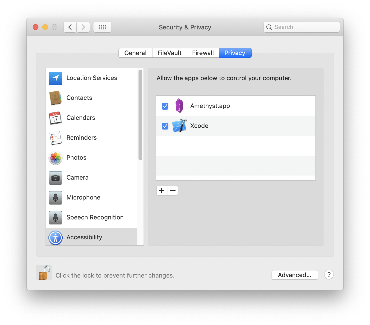 Amethyst must be given permissions to use the accessibility APIs under the Privacy tab of the Security & Privacy preferences pane as shown below.